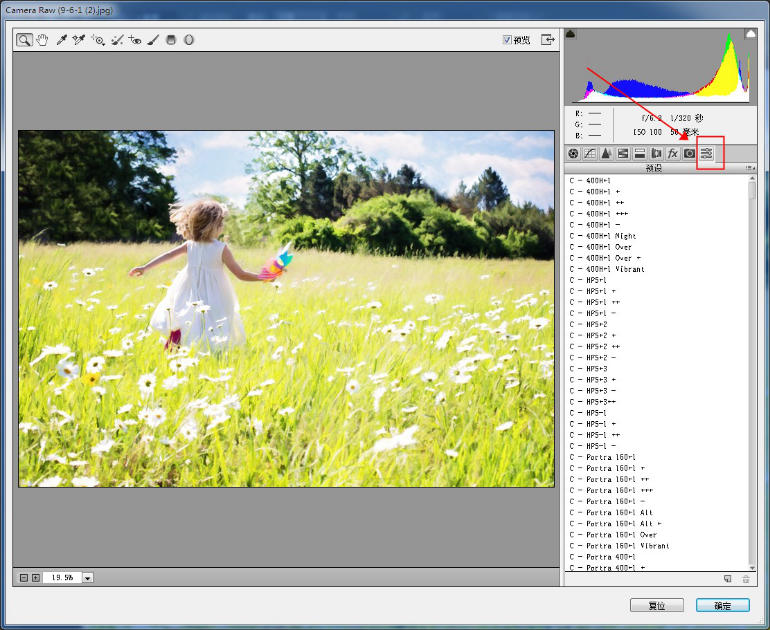 3、最后,打开一张照片,在PS里边设置默认用camera raw打开,点击图中红圈处的“预设”